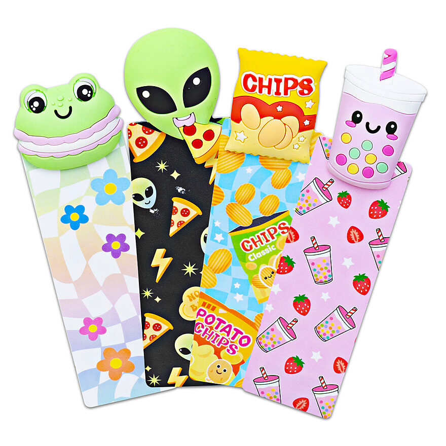 Pack includes 12 plastic-coated bookmarks with PVC toppers, three each of four designs.