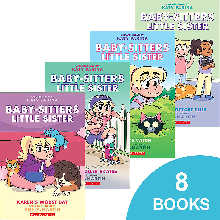 New skates! Scary neighbors! Bad haircuts! Kristy’s little stepsister Karen has a lot to deal with. This is the full-color graphic-novel spin-off series of the Baby-sitters Club. Eight paperbacks.