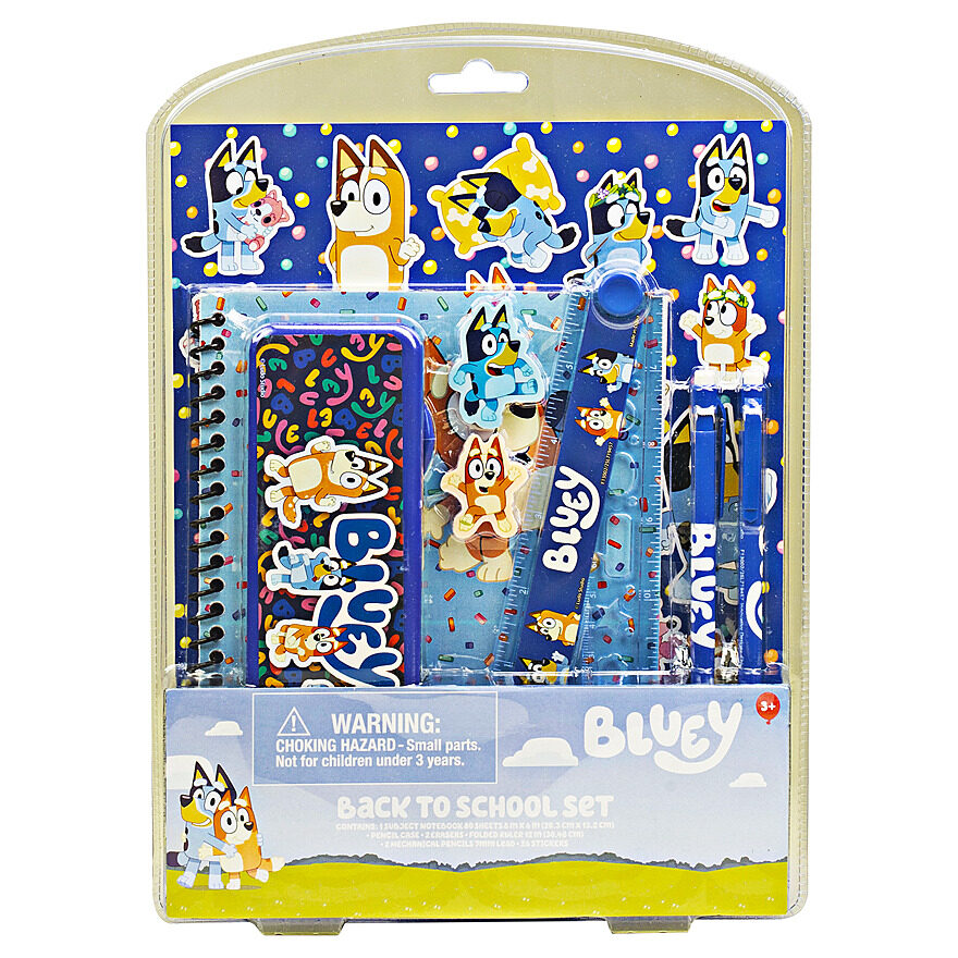 This set provides all the school essentials for Bluey fans! Includes notebook, pencil case, two erasers, folded ruler, two mechanical pencils, and 26 stickers.