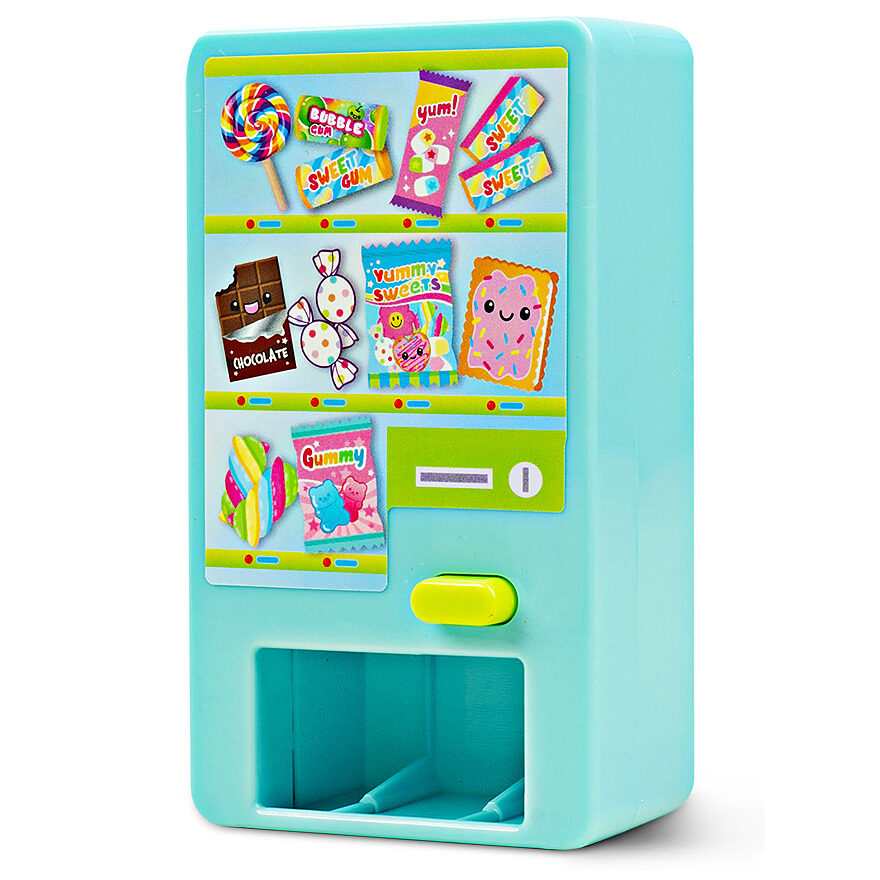 This cool plastic vending machine set comes with 5 erasers that can be used with it! Press the button, and the erasers vend out into the opening!