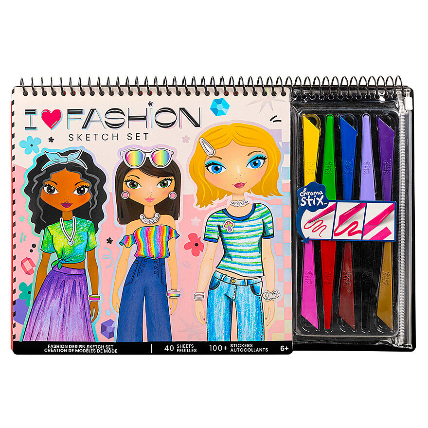 Fashion lovers can express their style and design their own outfits with this sketch set. With 40 sketch sheets, four stencil sheets, stickers and 10 Chromastix, fashionistas can design and entire wardrobe in their own unique style!