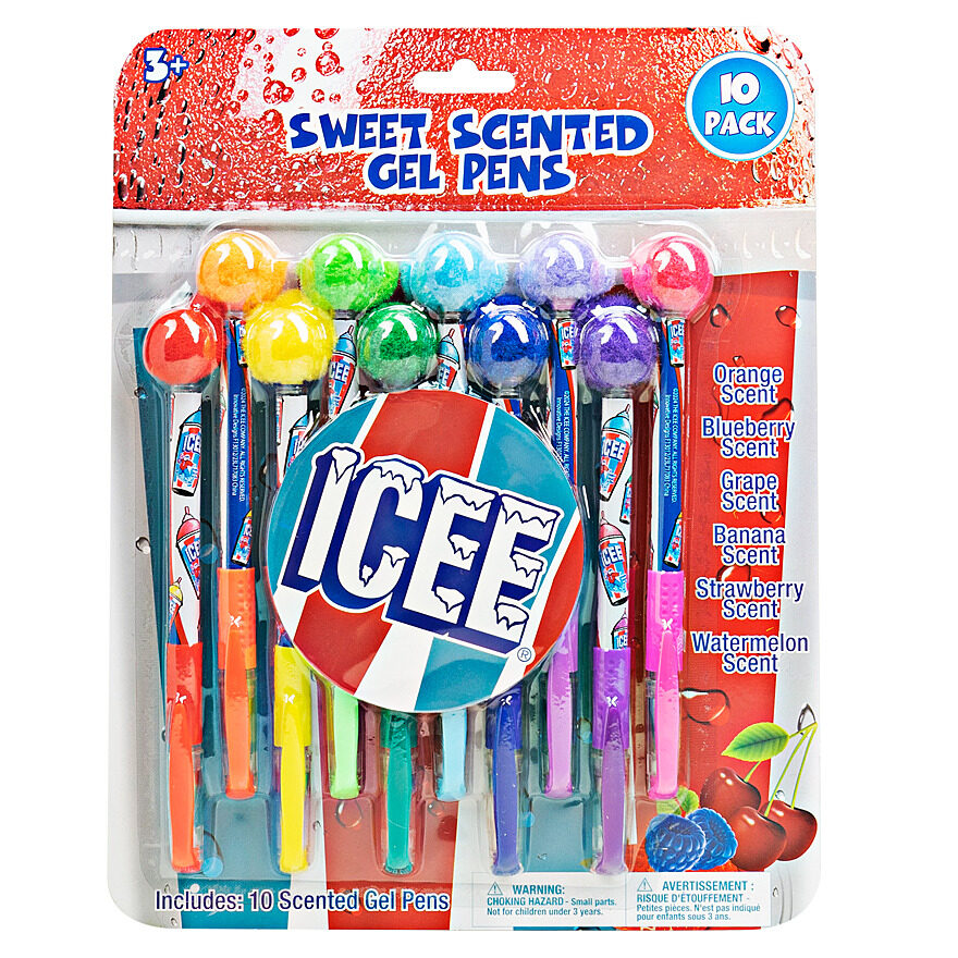 This pack comes with 10 sweet-scented, colorful gel pens in fun Icee prints and scents!