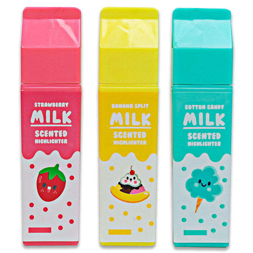 Make your ideas stand out with this adorable scented milk carton highlighter set. Set of three highlighters, including three different colors and scents: blue raspberry/cotton candy blue, strawberry pink, and banana split yellow.