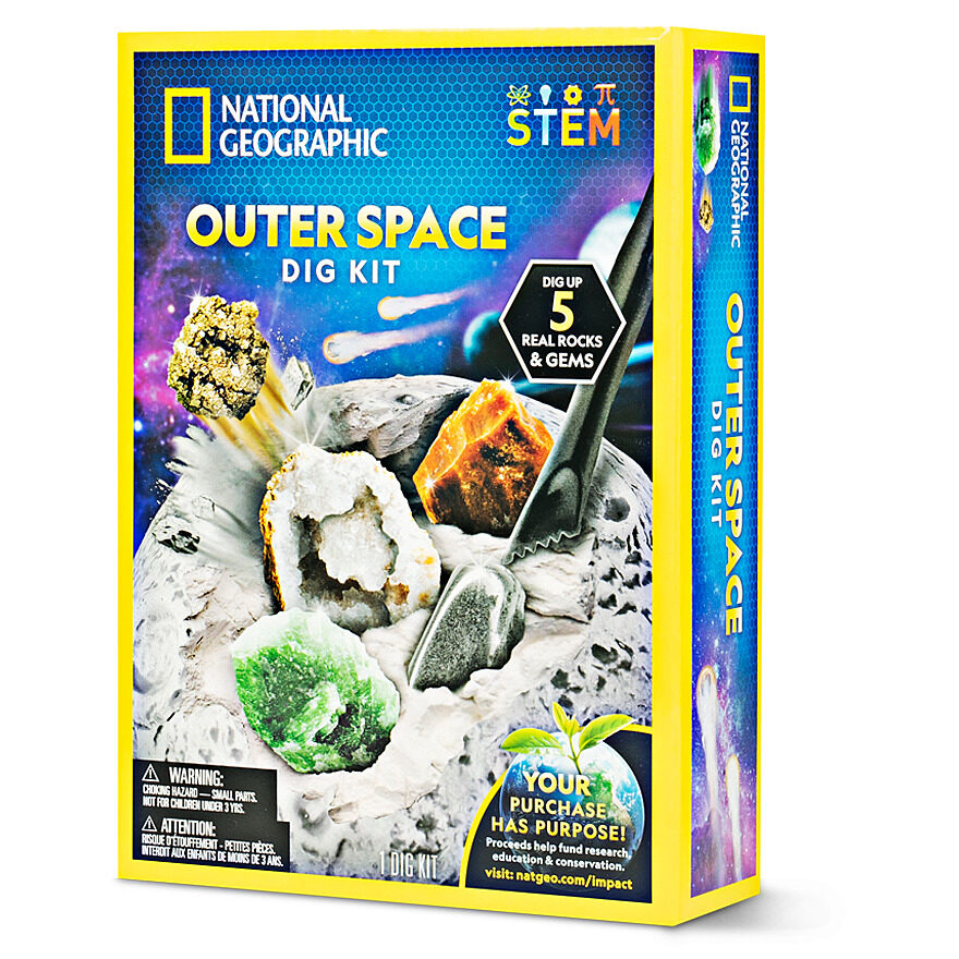 National Geographic Outer Space Dig Kit: This STEM science kit lets kids experience the thrill of discovery as they dig through the brick to reveal hidden treasures. Includes a dig brick with five genuine specimens, including pyrite, hematite, a geode piece, green fluorite, and red jasper. Includes digging tool to make finding rocks and gems easy.