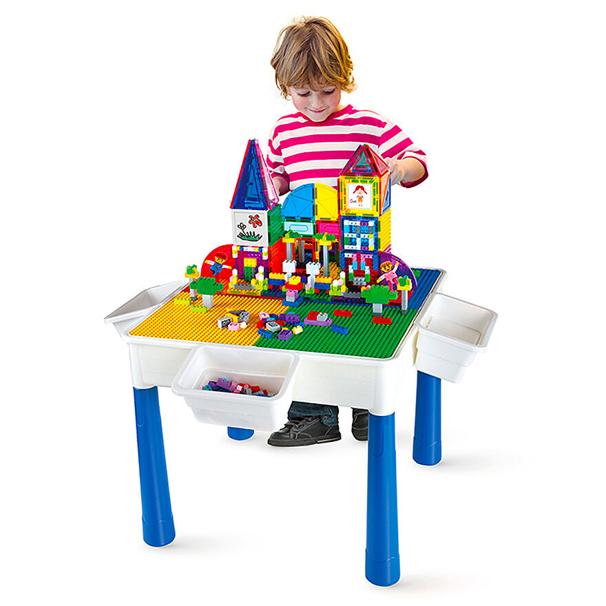 Set includes 585 pieces, including brick removal tool. Table measures 20.1"L x 20.1"W x 16.5"H. Ages 5+.