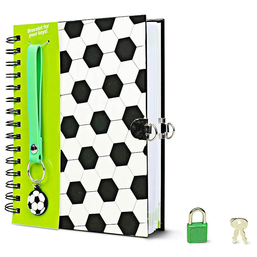 Score big with this spiral soccer diary! It comes with a lock and two keys, and a wristband with a keychain and a soccer ball charm.