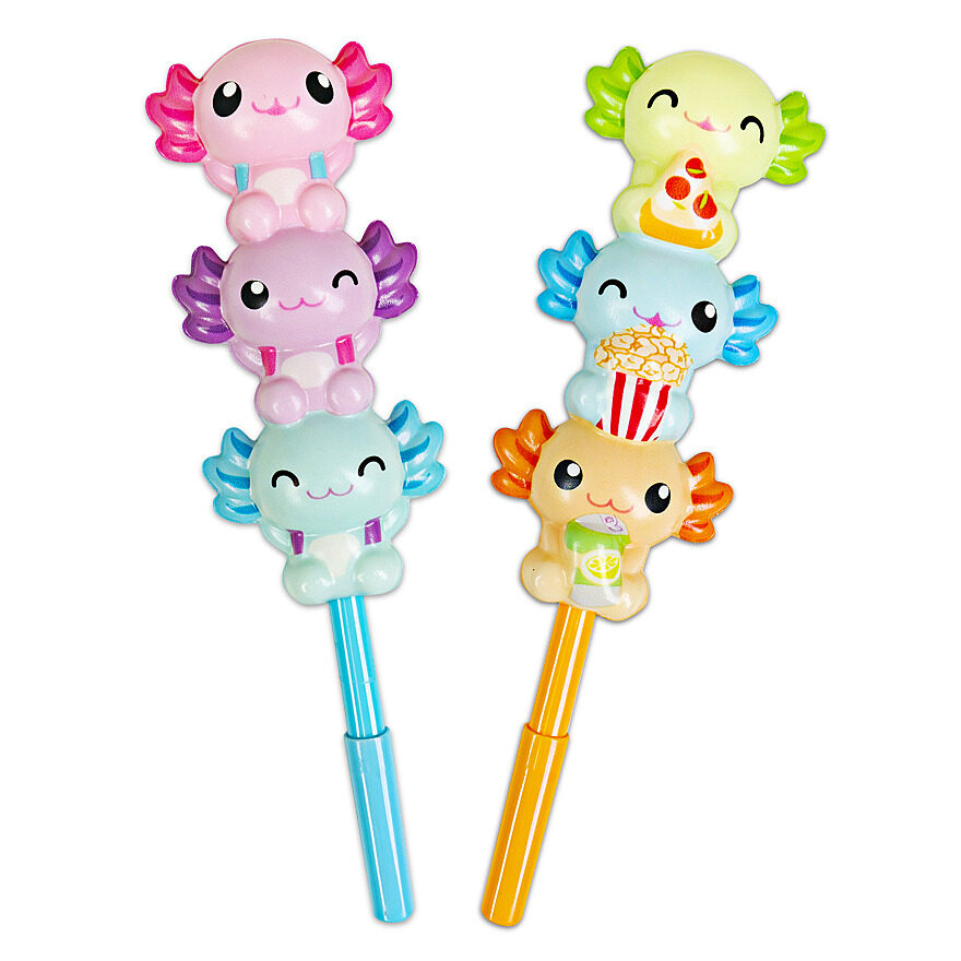 These squishy pens have three trendy and adorable axolotls stacked up on them! One pen per purchase; color and design may vary.