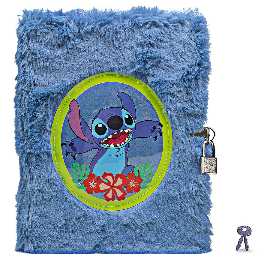 An adorable Stitch diary with soft, long fur, a Stitch cover patch, and a lock and keys.
