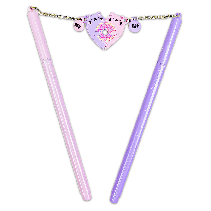 This set comes with two pens. Each pen has a BFF charm in the shape of cat holding a donut. Put the two charms together to make a heart! One set or pens per puchase.