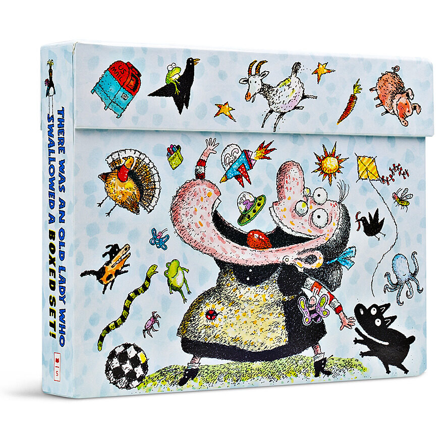 Box set includes a sticker book and ten picture books: There Was a Cold Lady Who Swallowed Some Snow!, There Was an Old Lady Who Swallowed a Shell!, There Was an Old Lady Who Swallowed a Cow!, There Was an Old Lady Who Swallowed a Fly!, There Was an Old Lady Who Swallowed a Birthday Cake!, There Was an Old Lady Who Swallowed a Rose!, There Was an Old Lady Who Swallowed a Bell!, There Was an Old Lady Who Swallowed Some Leaves!, There Was an Old Lady Who Swallowed Some Books!, and There Was an Old Lady Who Swallowed a Frog!