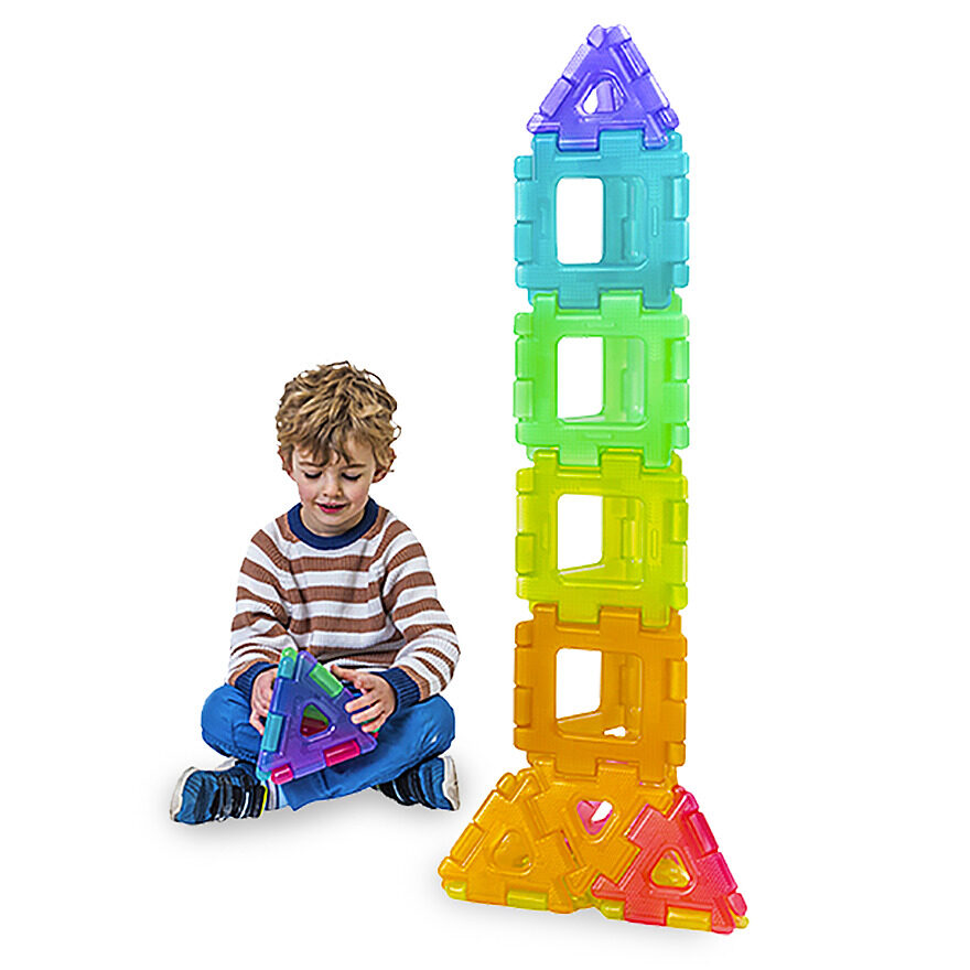 Create colorful constructions with this Translucent Giant Polydron! This 60-piece set contains equal numbers of squares and triangles in six stunning colors. Improve fine and gross motor skills through construction play. The set is suitable for both indoor and outdoor use.